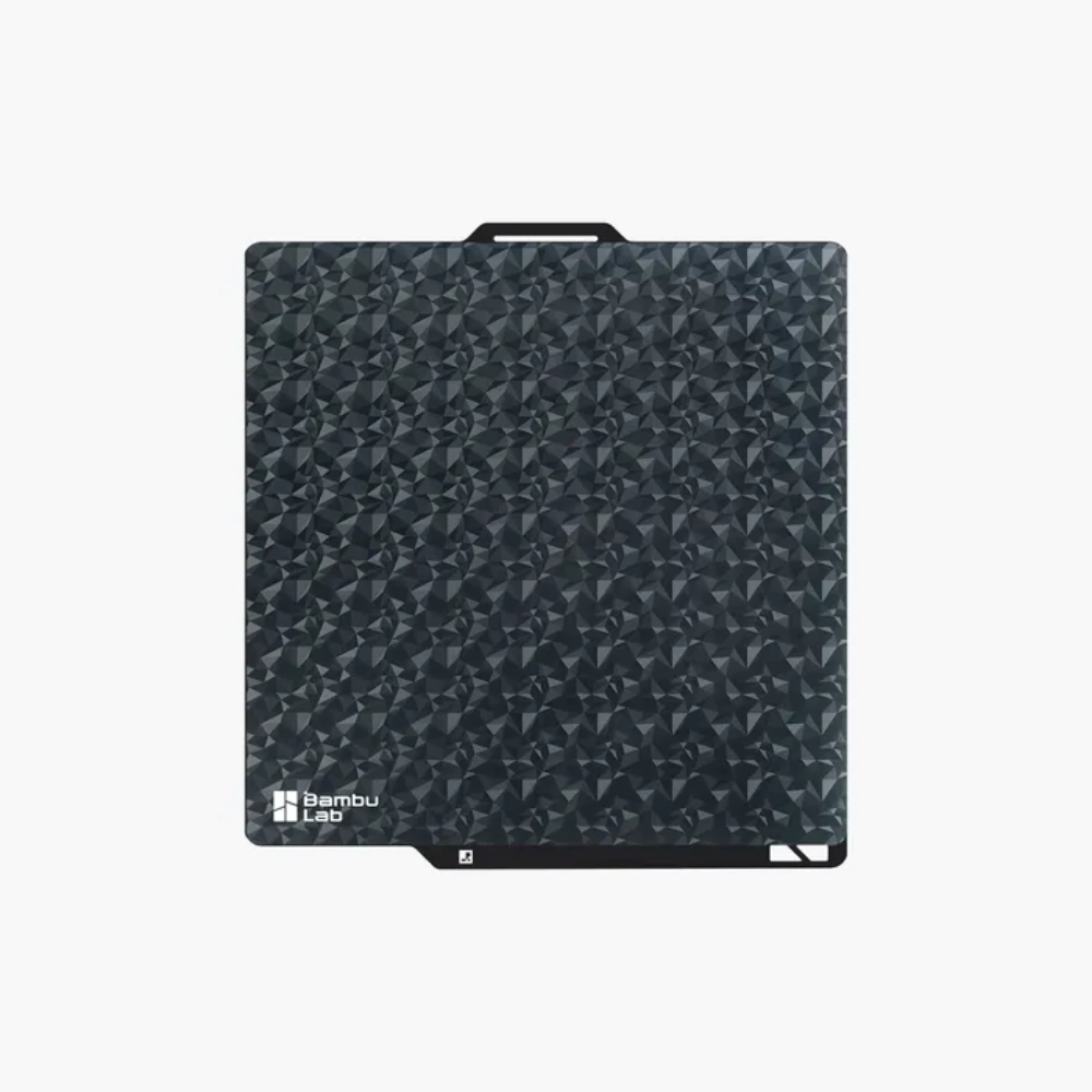 La Superficie de Diamante Bambu Lab (Diamond Surface Plate) ofrece un acabado visual único con efecto 3D en la primera capa, combinando reflejos brillantes y zonas mates sobre una superficie lisa. Es ideal para filamentos de seda o de acabado brillante, resaltando detalles, patrones decorativos y textos en tus impresiones 3D.