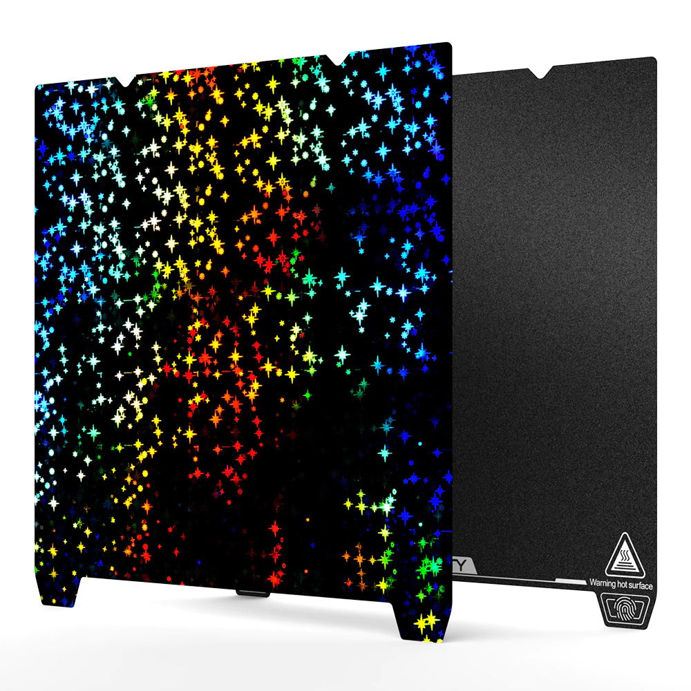 La Cama Magnética Holográfica Doble Cara de Creality combina estética y funcionalidad en un solo producto. Una de sus caras incluye un acabado holográfico “Stars” multicolor, brindando un aspecto visual único a tu impresora, mientras que la otra cara posee un PEI texturizado que garantiza excelente adherencia y un desmoldeo sencillo.