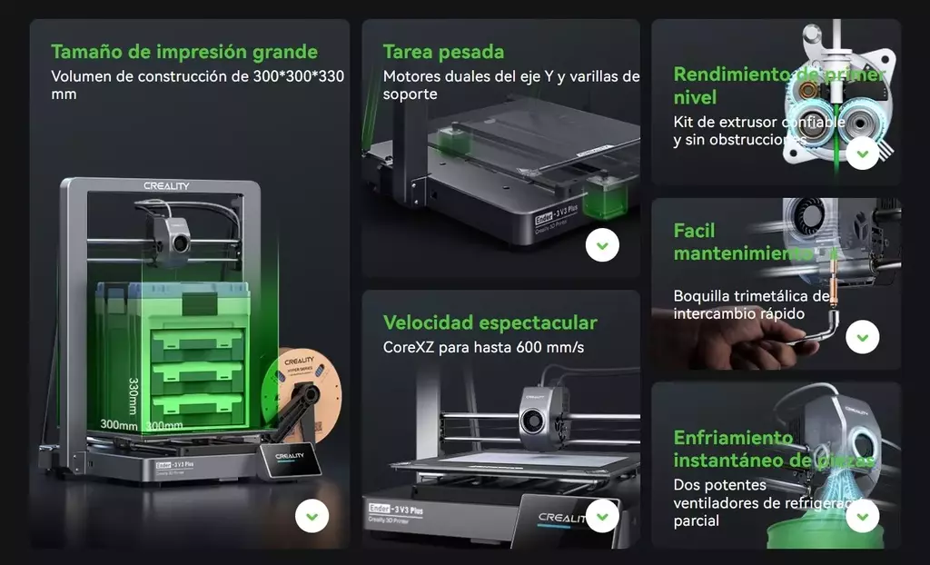 La Creality Ender 3 V3 Plus es una impresora 3D FDM de gran volumen y alta velocidad, ideal para proyectos grandes, piezas funcionales y producción de múltiples modelos a la vez. Su arquitectura optimizada, el sistema de movimiento rápido y la extrusora Direct Drive la convierten en una excelente opción para emprendedores, talleres y usuarios avanzados.