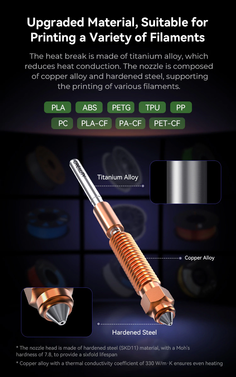 Este hotend permite trabajar hasta 300 °C, haciéndolo apto para filamentos técnicos como ABS, PETG, PC, Nylon y otros materiales de mayor exigencia térmica, además de los plásticos estándar de uso cotidiano.
