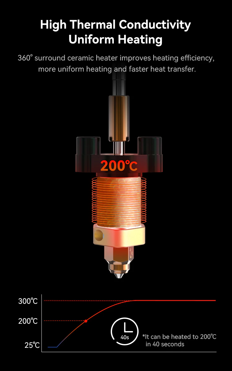 El sistema de calefacción de 360° proporciona un calentamiento envolvente que aumenta la eficiencia térmica y mejora el flujo del filamento. Esto permite imprimir a mayor velocidad sin comprometer el detalle ni la calidad superficial de las piezas.