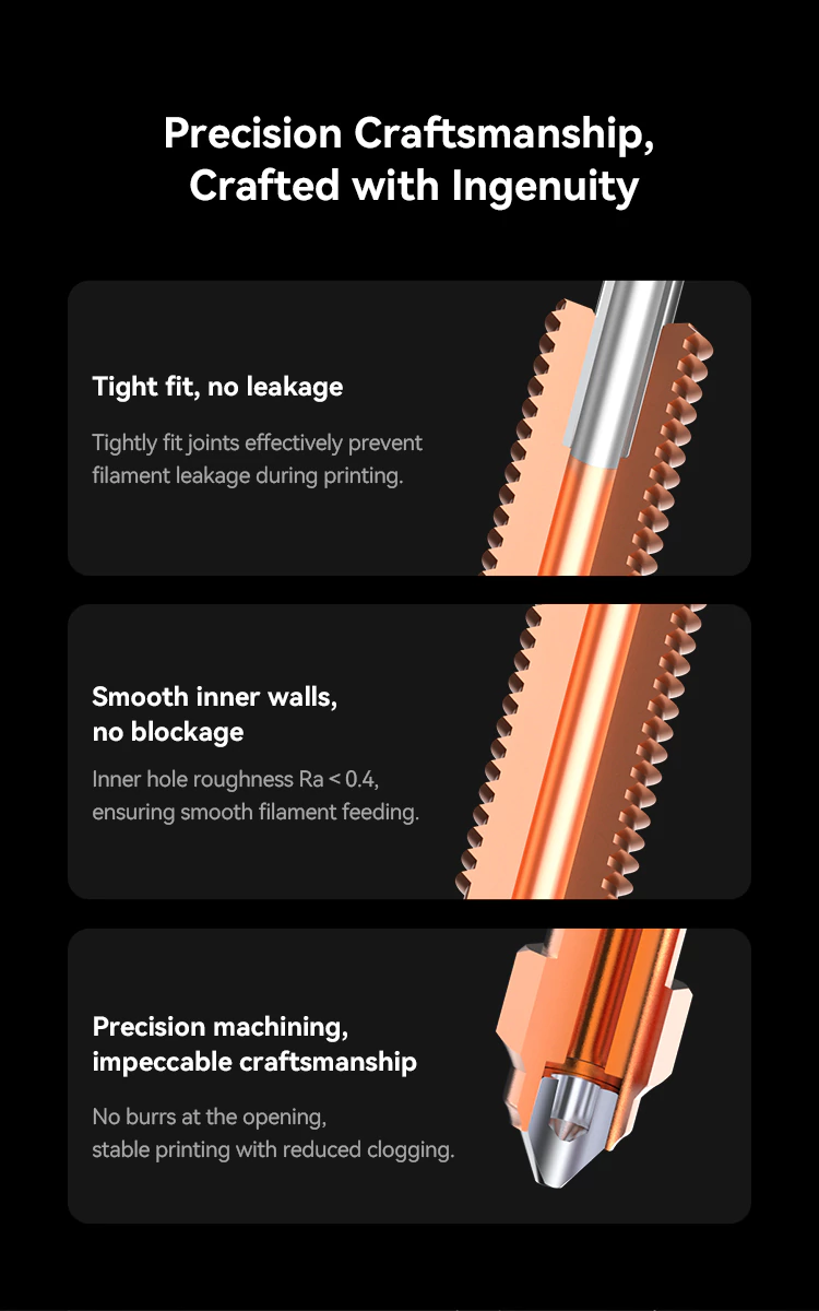 La Boquilla Unicorn elimina completamente el uso de tubos de teflón internos. No requiere mantenimiento, soporta altas temperaturas y evita fugas de filamento. De esta forma se consigue una extrusión más estable, precisa y duradera, reduciendo la necesidad de intervenciones frecuentes en el hotend.