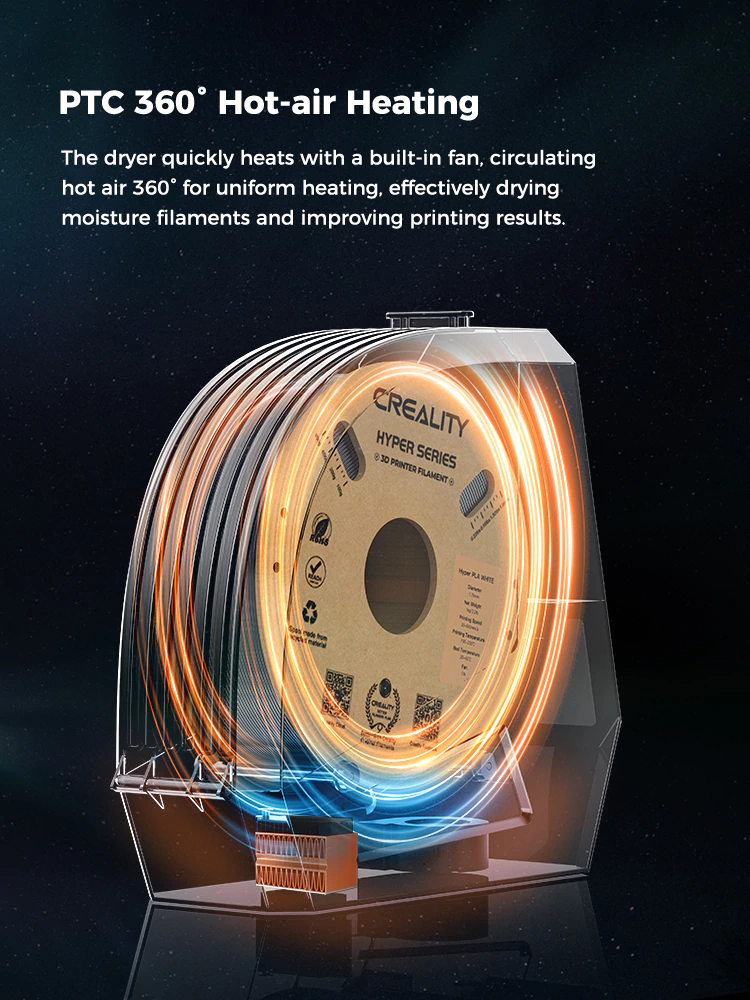 El Creality Space Pi Filament Dryer es la herramienta ideal para mantener tus filamentos secos, estables y listos para imprimir. Gracias a su sistema de calefacción 360°, control preciso de temperatura y monitoreo constante de humedad, garantiza resultados de impresión consistentes y sin defectos. Diseñado para eliminar la humedad presente en materiales sensibles como PLA, PETG, ABS, TPU y Nylon, mejora la adhesión, estabilidad y calidad final de cada pieza.